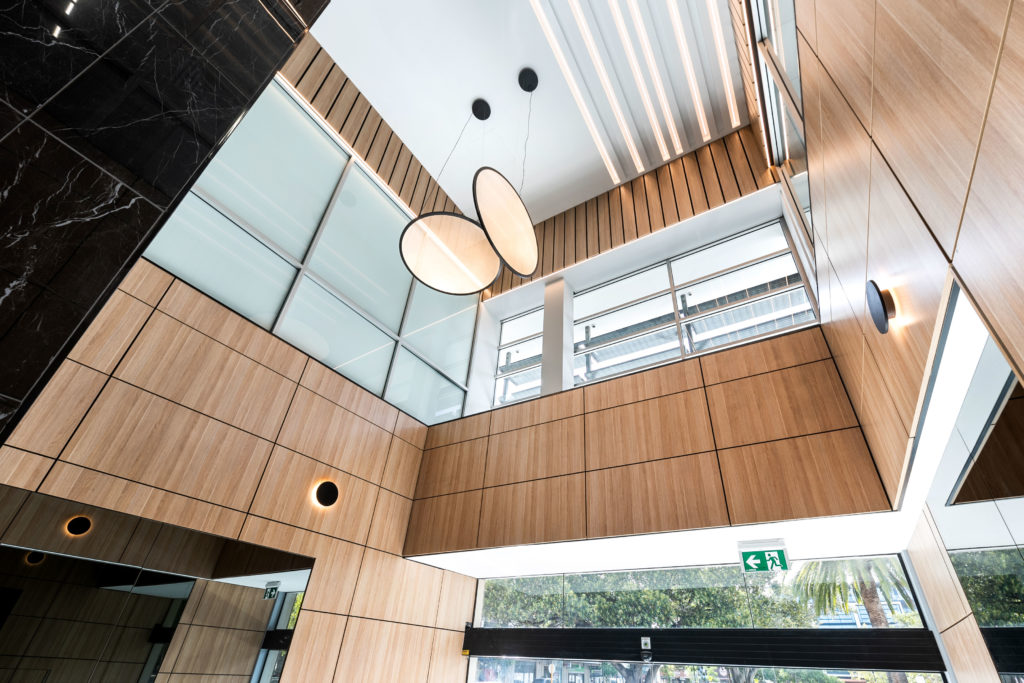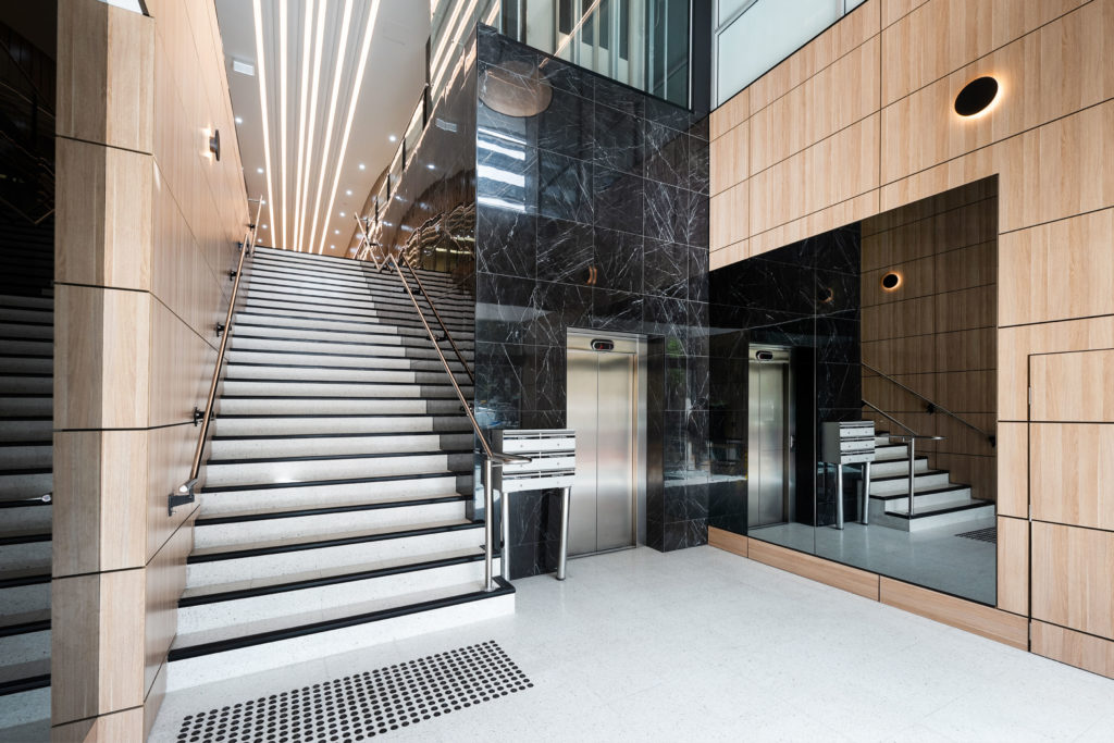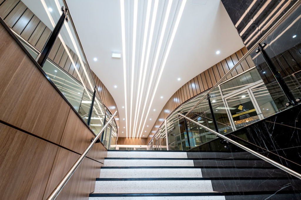 Works consisted of installation of Natural Oak Laminated Panels to the walls, Smoked Mirrors, New Automatic Doors, Extensive Lighting Panels to Ceiling and Feature Lighting, Stair Nosings, Quality Floor and Wall Tiling.